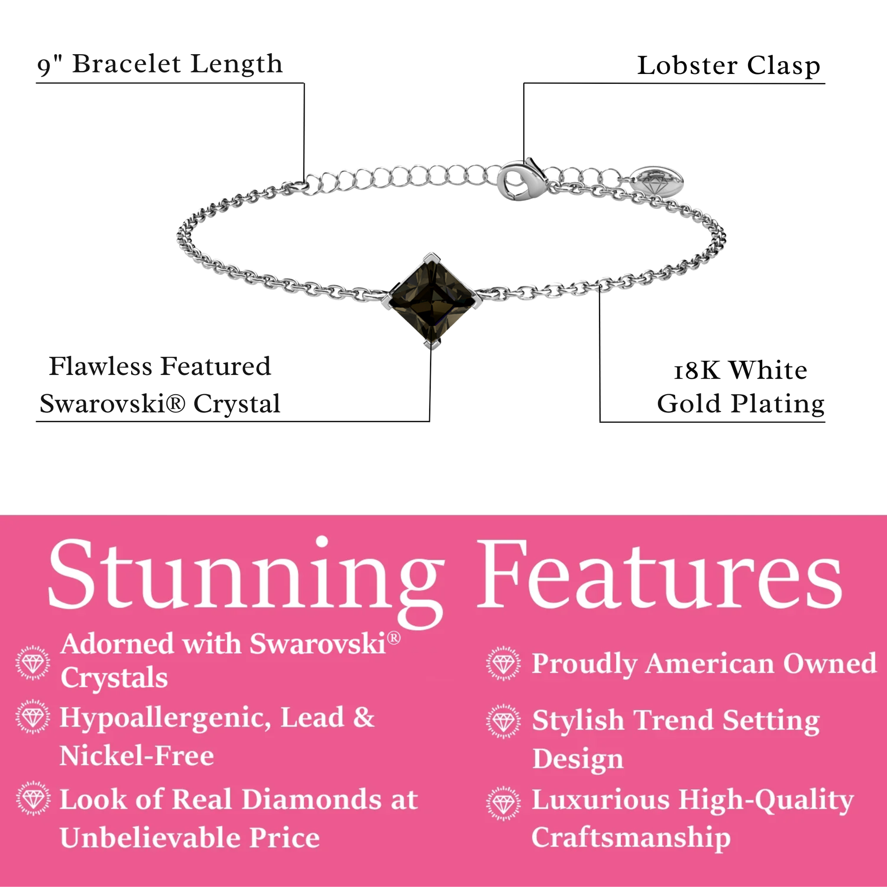 The Samantha 18k White Gold Plated Bracelet is a sophisticated piece that combines elegance with a bold touch. Featuring a stunning black Swarovski® crystal, this bracelet adds a refined and modern sparkle to any outfit. Crafted from hypoallergenic brass and plated with luxurious 18k white gold, it offers both durability and comfort. The sleek design makes it versatile enough for both everyday wear and special occasions. Beautifully packaged in a Cate & Chloe gift box, the Samantha bracelet is an ideal gift or a chic addition to your jewelry collection.