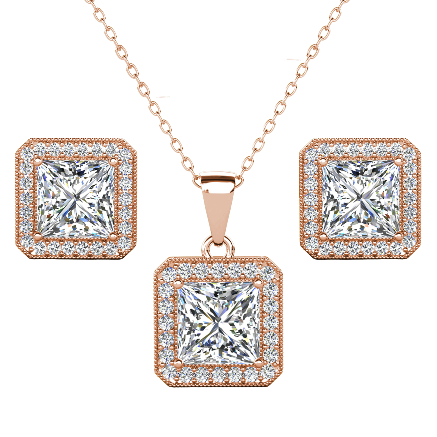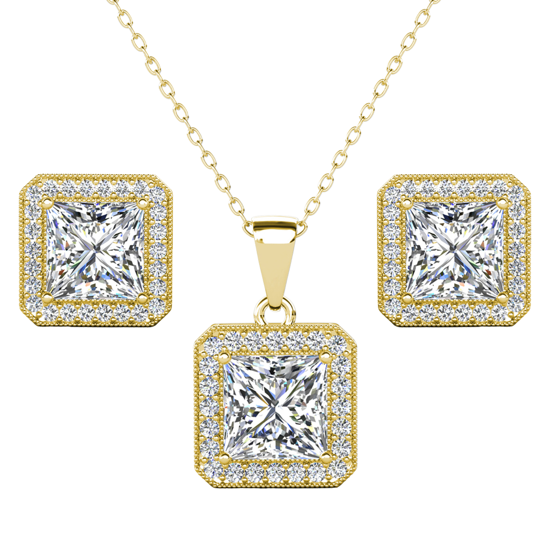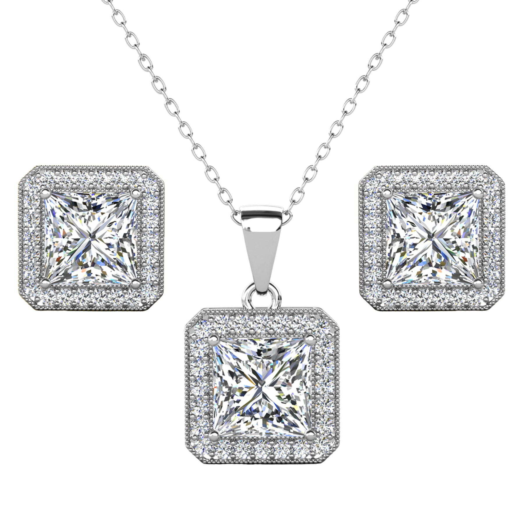 Londyn 18K White Gold Princess Cut Halo Necklace and Earrings Jewelry Set with Simulated Diamond Crystals