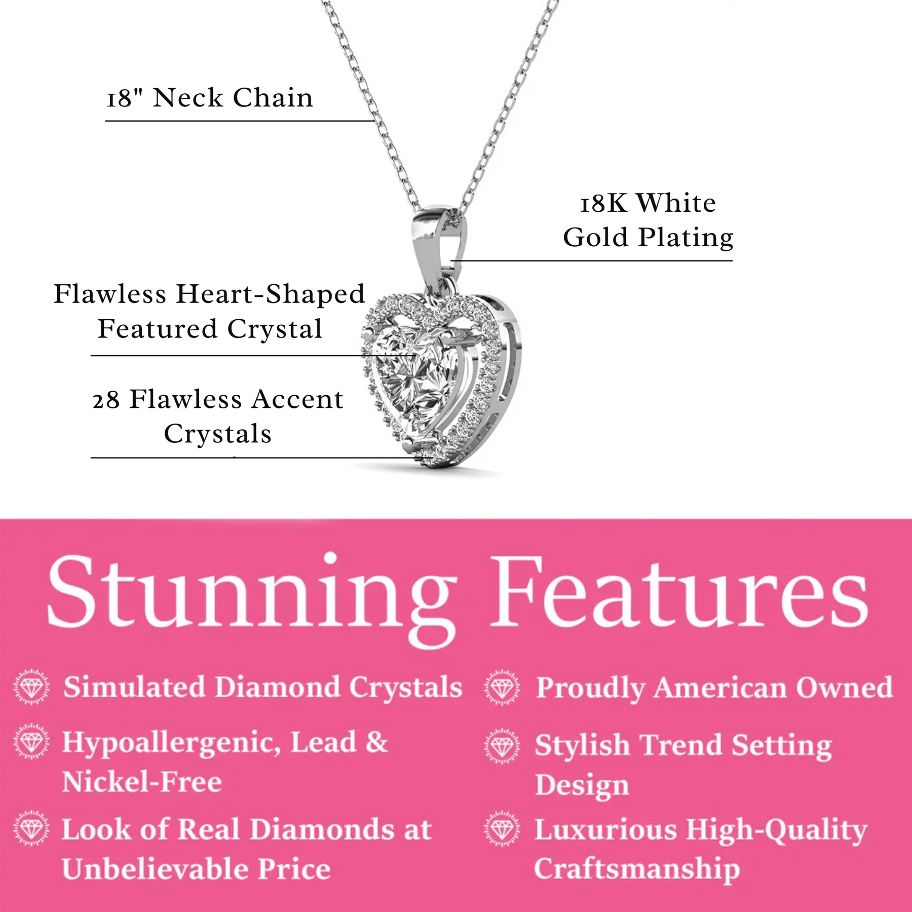Amora 18k White Gold Plated Halo Heart Pendant Necklace with Simulated Diamond Crystals