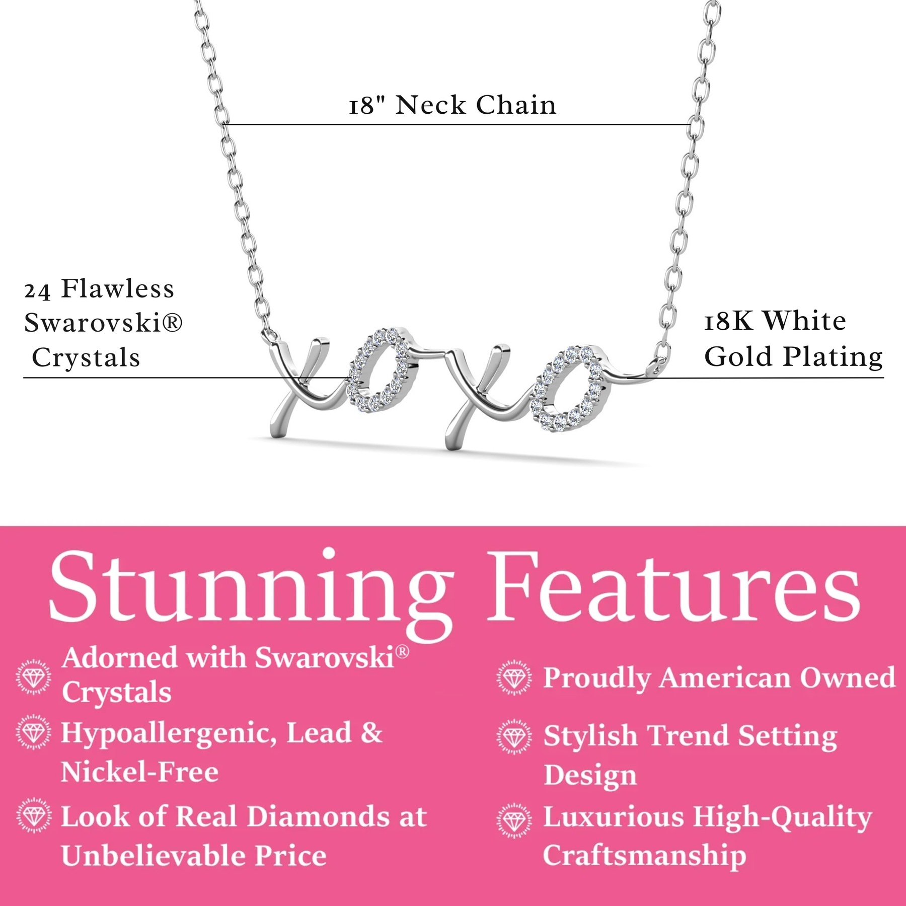 Share love and sparkle with the Jocelyn XOXO Pendant Necklace, a charming piece designed to shine with sentiment. Crafted from hypoallergenic brass and plated in luminous 18k white gold, this necklace features an elegant “XOXO” pendant accented with brilliant Swarovski® crystals for a radiant, eye-catching finish. The 18" chain with a secure clasp ensures everyday comfort and durability. Beautifully presented in a signature Cate & Chloe gift box, the Jocelyn necklace makes a heartfelt gift for someone special—or a sweet addition to your own jewelry collection.