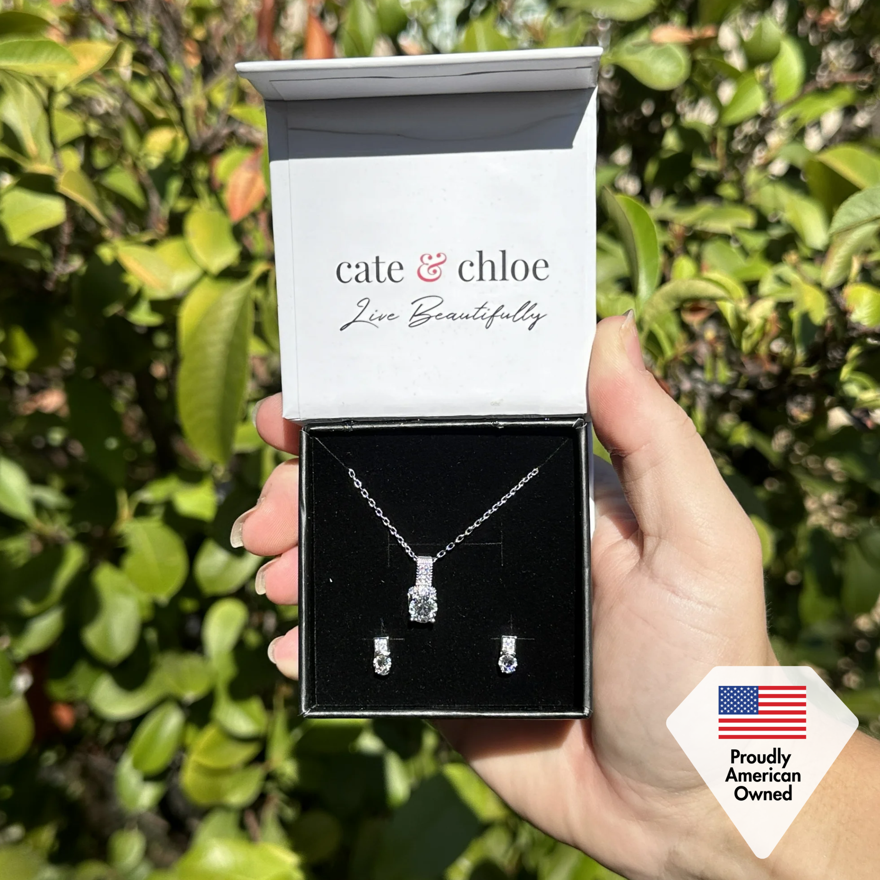 Cate & Chloe Waverly hoop earrings on gift box with brand promises Cate & Chloe necklace on white gift box with macarons, highlighting luxury jewelry and free gift box