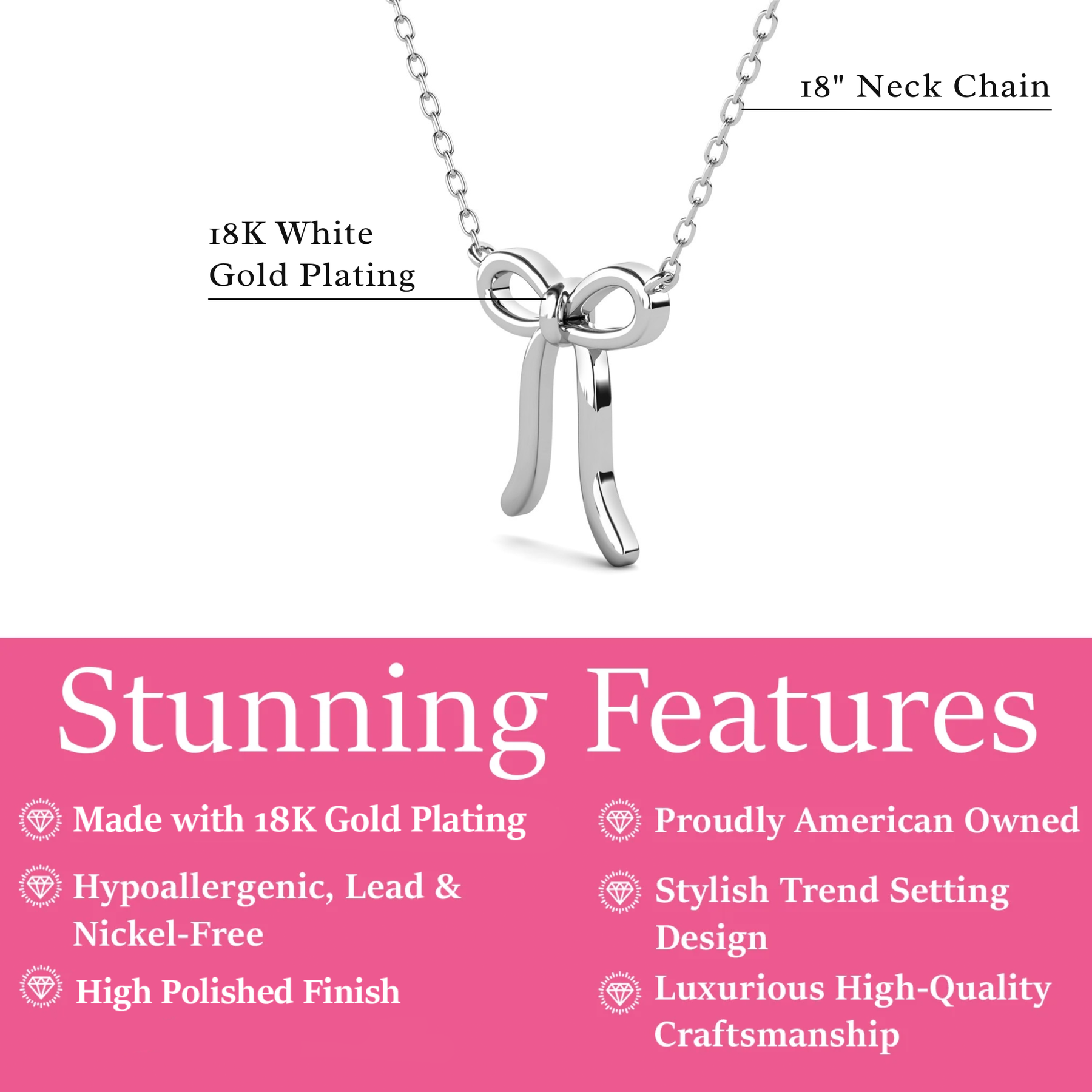 Introducing the Lola 18k White Gold Plated Ribbon/Bow Pendant Necklace, perfect for anyone who loves a touch of elegance with playful charm. Crafted in polished 18k white gold plating, this sleek ribbon-inspired bow pendant symbolizes femininity, grace, and timeless style. Suspended from a fine chain, it offers a sophisticated yet delicate accent that’s ideal for everyday wear or gifting.