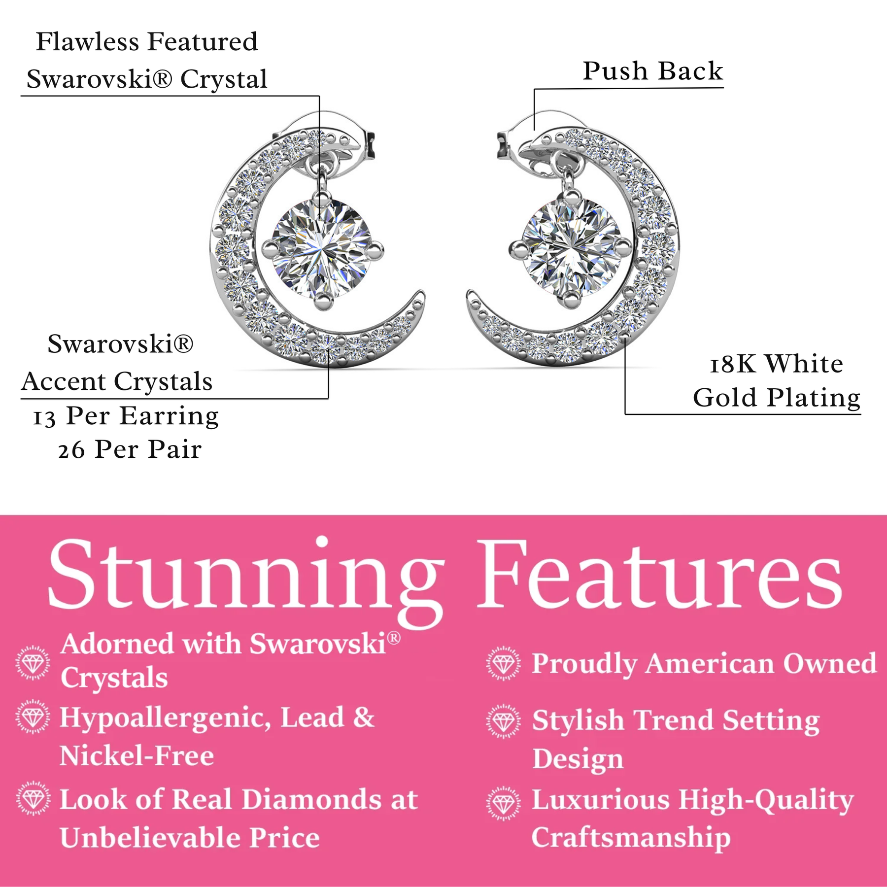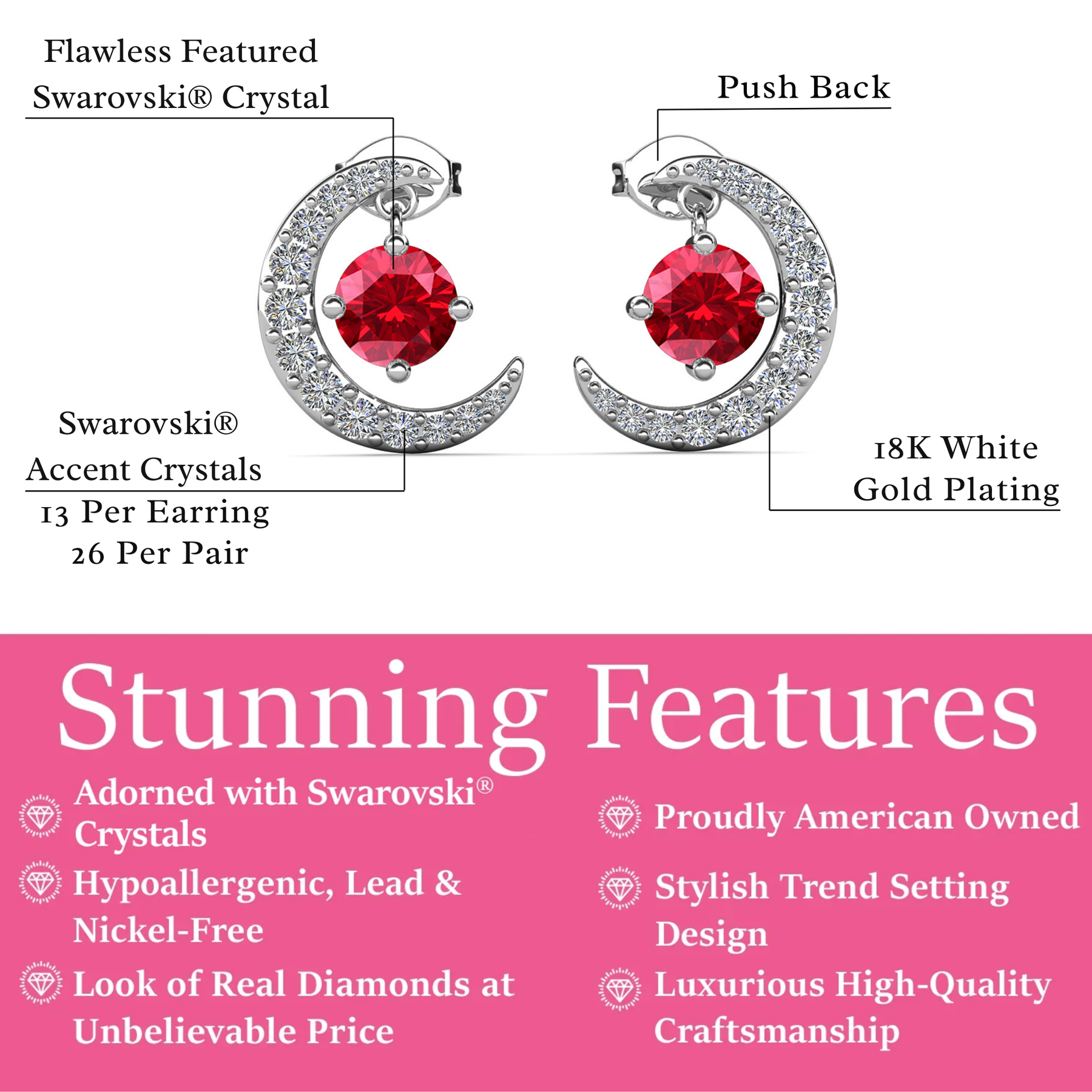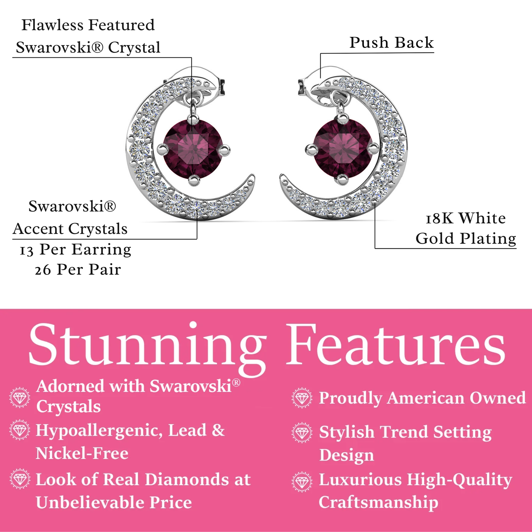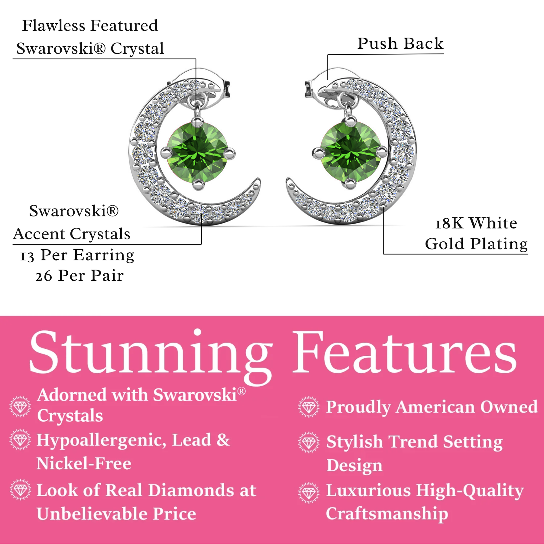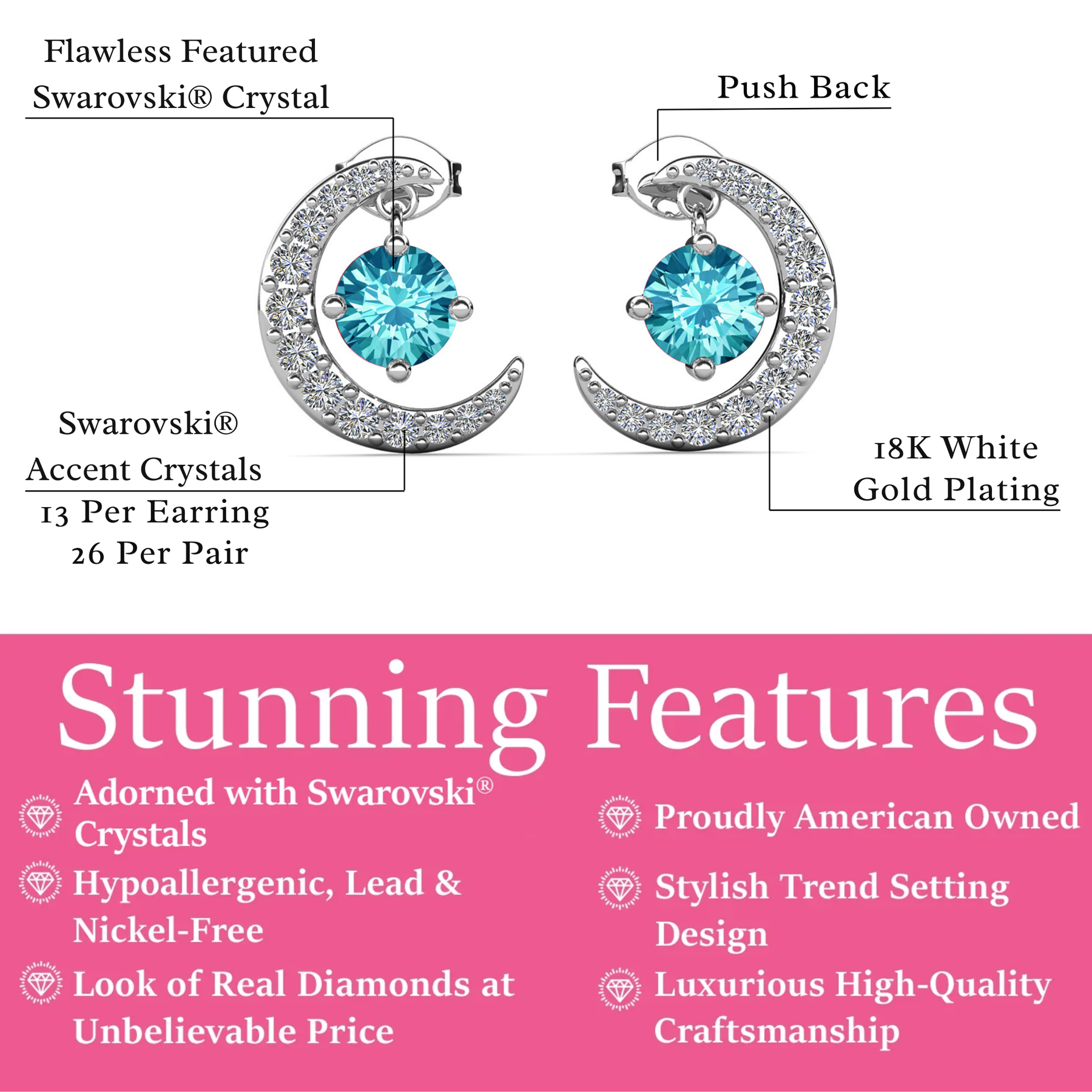 这些生日石耳环采用令人惊叹的新月形设计,饰有 优质圆形切割水晶可提供恰到好处的闪光,可搭配任何场合的任何服装。 18k 白金镀黄铜材质提供奢华的外观和感觉,使其成为完美的时尚配饰。