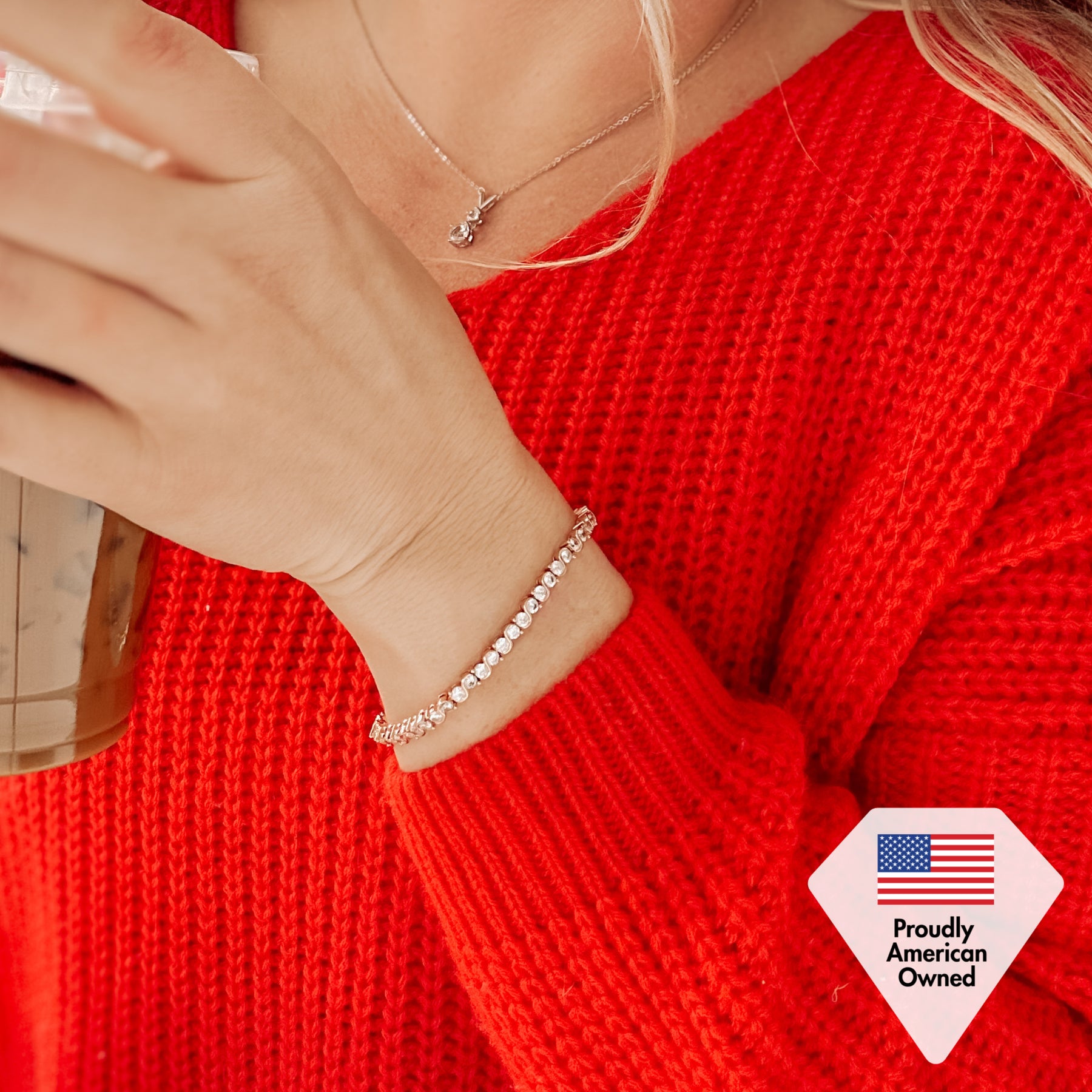 5 毫米宝石精心镶嵌在光泽的 18k 白金镀黄铜底座上,确保耐用性和光泽。这款女士银手链长 7.5 英寸,散发着精致和优雅的气息,通过舌扣牢固闭合。防过敏且不含铅和镍,是送给她的完美礼物,装在迷人的 C&C 品牌礼品盒中。