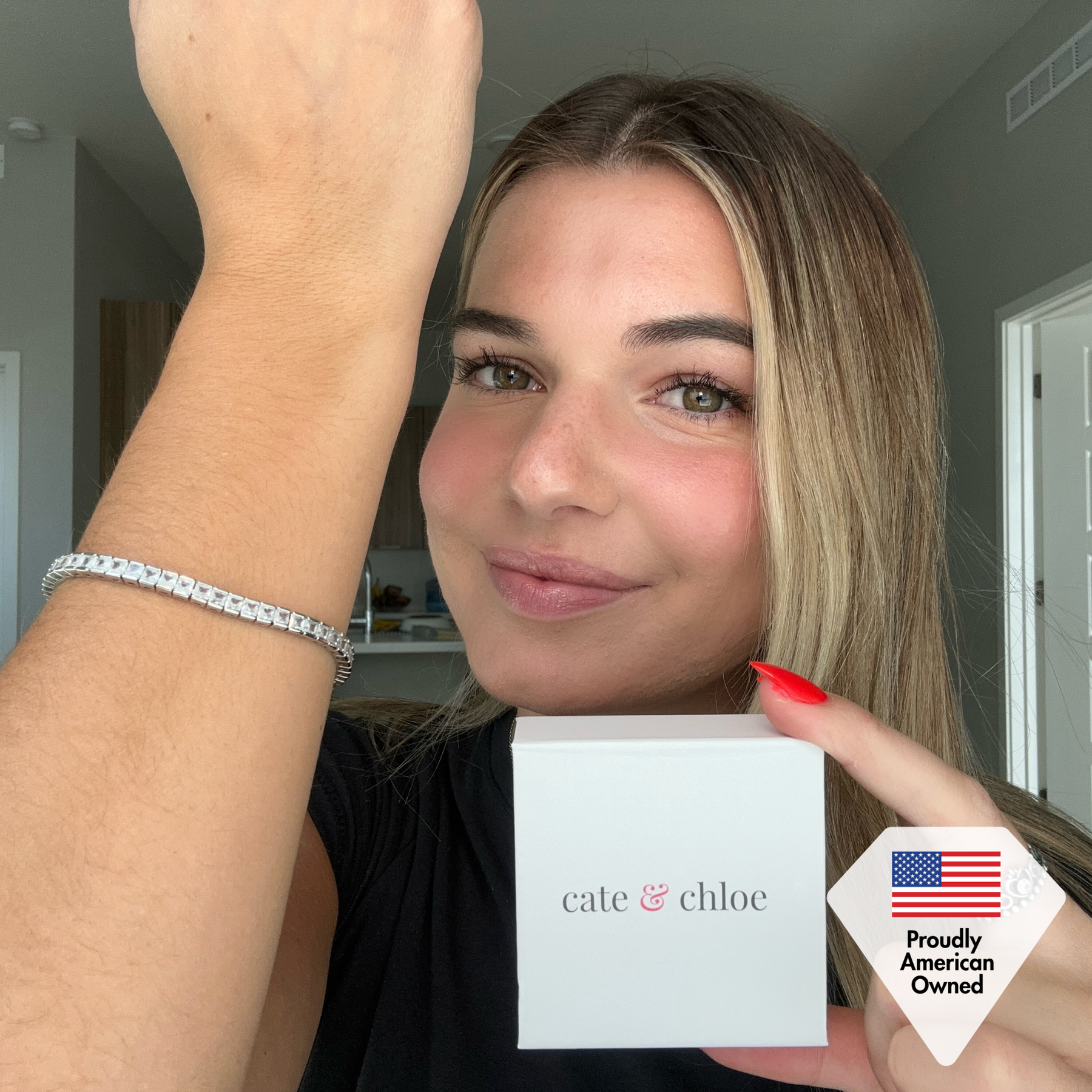 Leila 18k 白金镀方晶锆石网球手链提升您的优雅气质。这款女士银手链饰有34 颗耀眼的 5 毫米仿真钻石晶体,散发着永恒的魅力。